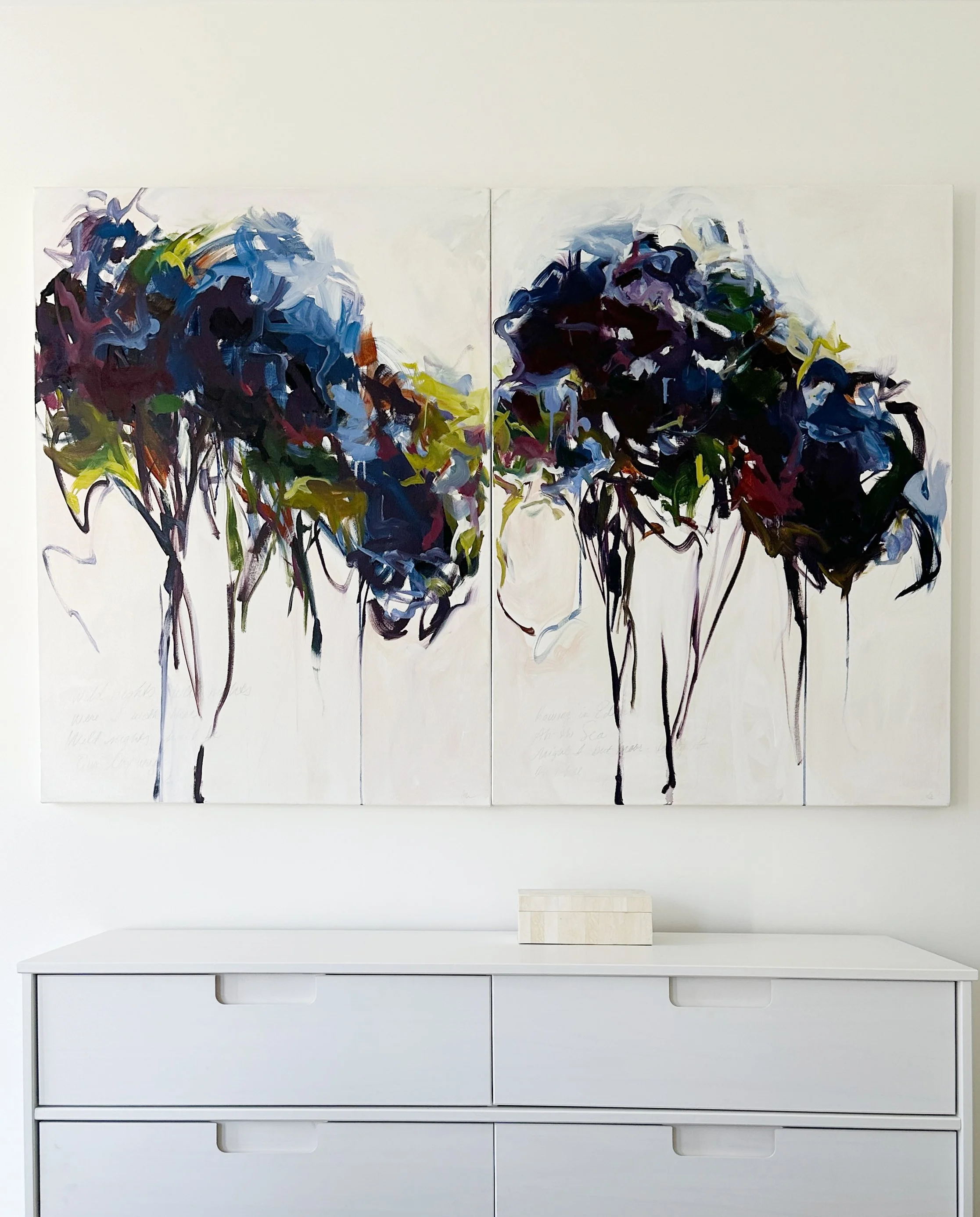 Supple passions are the theme of these works. With Emily Dickson's poem Wild Nights as a jumping-off point, I wove the story of two lovers within this diptych, always a breath apart, forever entwined. You will see the poem, verses 1 and 3, tucked underneath the paint.